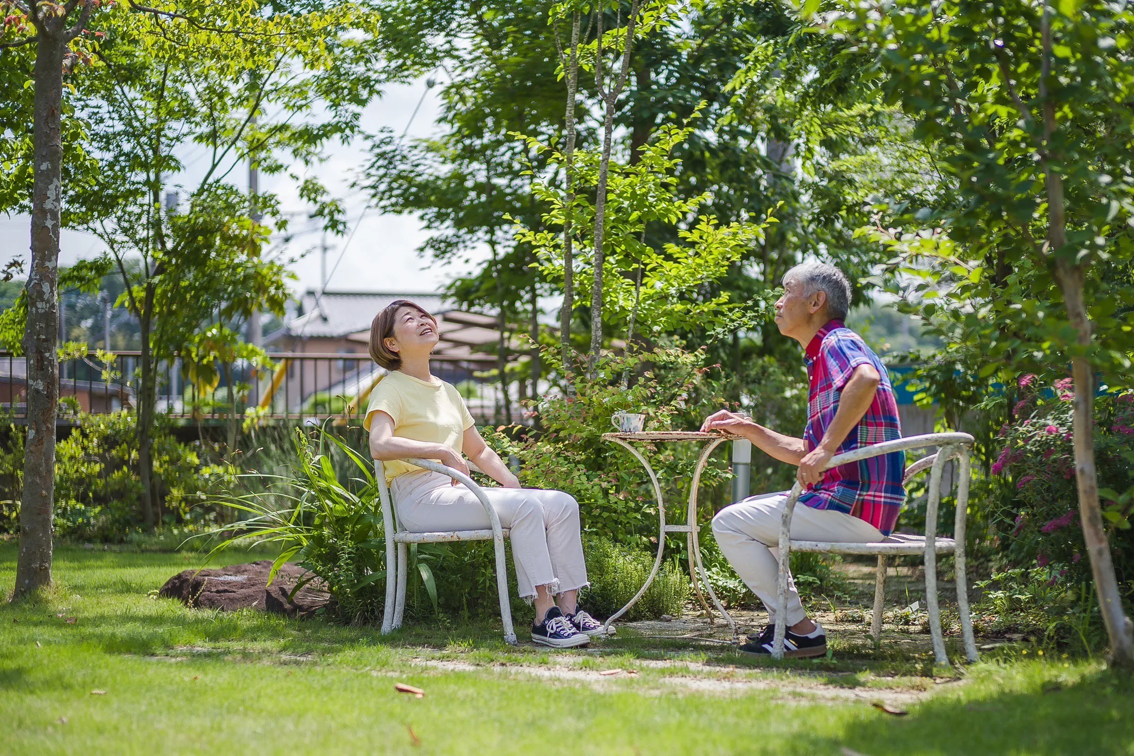 庭に置かれたガーデンチェアに寄りかかり、美しい緑の中でお茶をする